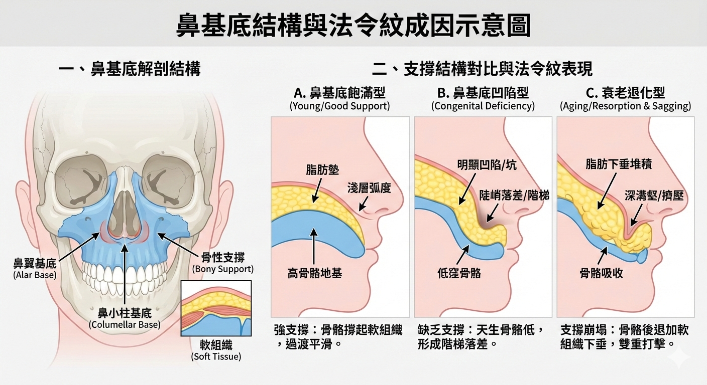 法令紋並不是一條單純的皺紋,而是臉部中段支撐結構逐漸流失後,皮膚順著重力塌陷所形成的凹線。