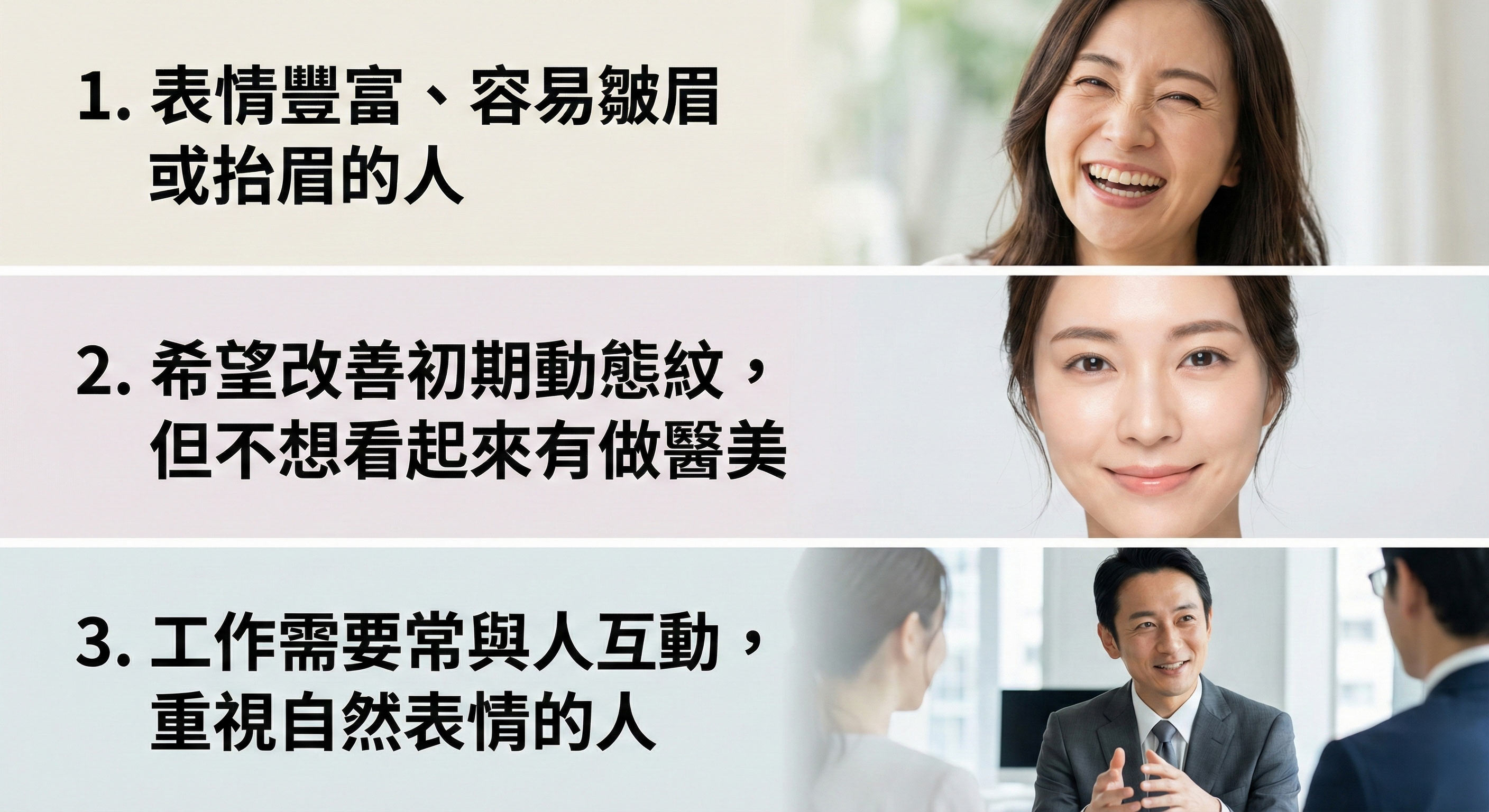 專業醫師在評估時, 會先觀察表情動作與肌肉活動模式, 再決定是否需要肉毒、施打位置與劑量, 而不是套用制式流程。